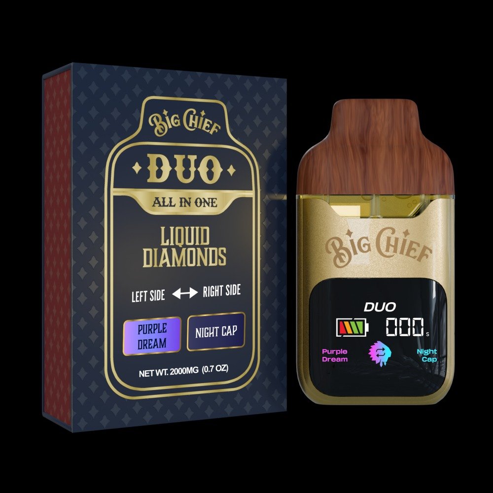The Big Chief Duo All-in-One 2 g disposable vape features two 1 g strain-specific chambers: Purple Dream and Night Cap, housed in a sleek rechargeable device with strain-switching toggle—designed for seamless mood tuning from calm focus to deep sedation
